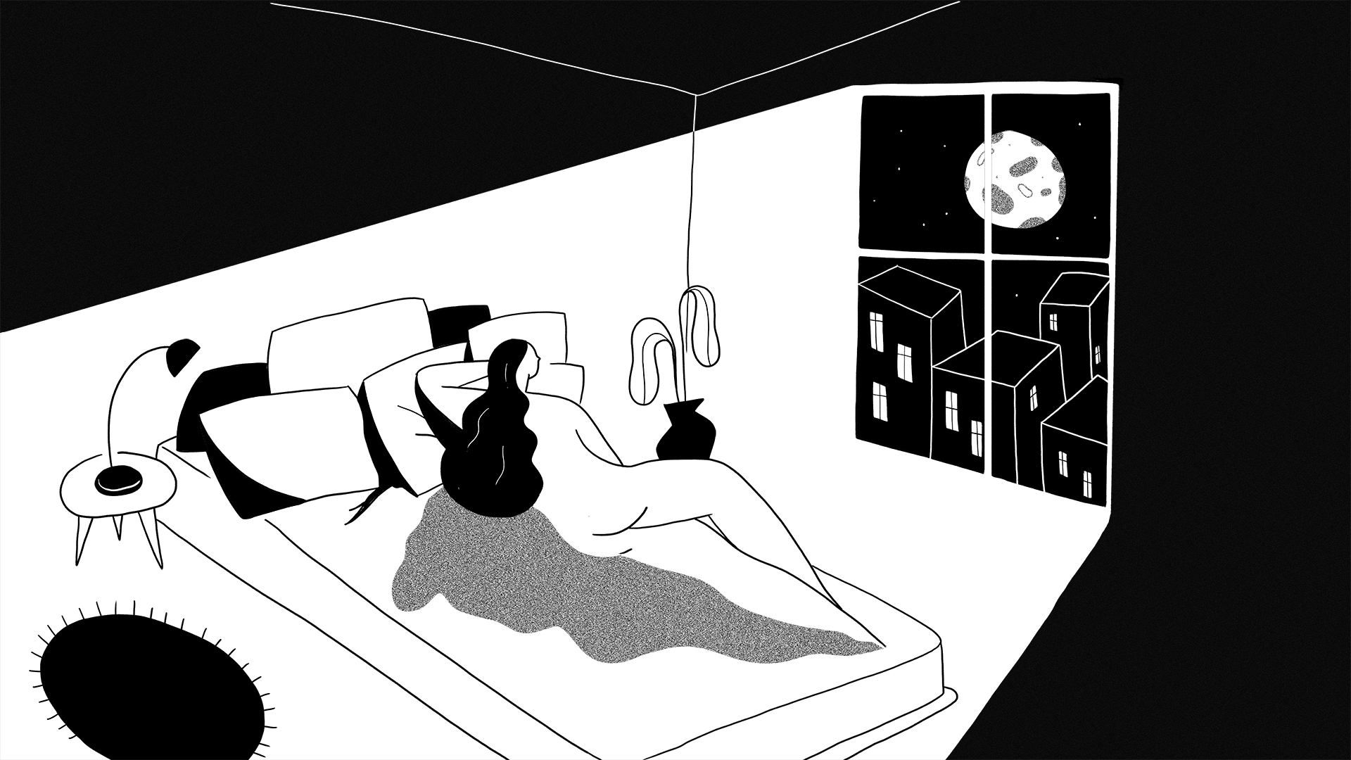 On the Moon, women have fun while they wait to be illuminated by the sun. They play volleyball with Neil Armstrong’s astronaut helmet, they masturbate in the darkness of the cosmos, and constellations are tattooed on their backs. Sunlight begins to seep and the white surface lights up increasingly. Women come together and enjoy this solar bath. A beam of light shines on the bed where a girl sleeps, on Earth. The light disturbs her dreams; the unveiled girl looks through the window and discovers the full moon shining on her head.