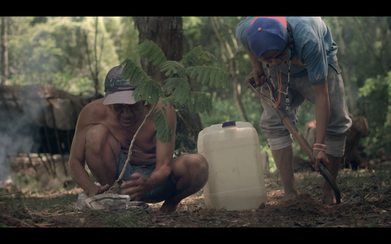 Itaeté (old man) and Ulises (15 years old) are immersed deep in de Misionera Jungle, camping. Ther are both Guaraní Indians and are working to turn a timbó tree into a traditional canoe. Itaeté is trying to instil the traditional legacy of canoe construction into the boy, but the boy doesn’t seem to show much interest. His true calling is music. He’s a prapper. Due to a little argument between them, the old man decides to manipulate the tree trunk by himself. It turns out to be too much for him to handle and the tree trunk rolls over the fire and starts to burn. Ulises runs to help him and, together, are able to save the canoe. But, while doing so, a coral snake bites the old man. Ulises doen’t realise this and continues to turn off the fire. The old man goes into the forest in search of a medicinal plant. After healing himself, he prays to his God for assistance. As night comes, Ulises goes to sleep, still mad about the quarrel. The boy ignores Itaeté’s predicament. On the following morning, the old man rises, convalescent. His arm swollen because of the venom. The boy notices the bite and carries him to the motorboat. They start their journey back home, but the old man is in a serious condition. During the journey, the boat runs out of gas and the boy starts rowing. By the time he gets reception on his phone, the old man is dead, but before dying, he has asked the boy to finish the work they had started together. Ulises goes back to the camping, burries the old man close to a young Timbó tree, and goes back to work on the Timbó tree trunk. As he removes the burnt bark with blows from his machete, he uses the beat of his work to start rapping again. His song speaks of Itaeté and the pride of being Guaraní. This time he isn’t rapping in Spanish. This time, Ulises raps in Guaraní.